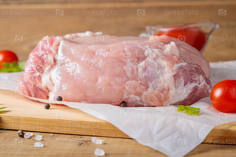 Кусок сырой свинины на разделочной доске. Помидоры, кетчуп