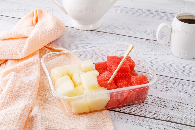 Фруктовый салат с арбузом и дыней в пластиковом контейнере на деревянном фоне. Фото высокого качества