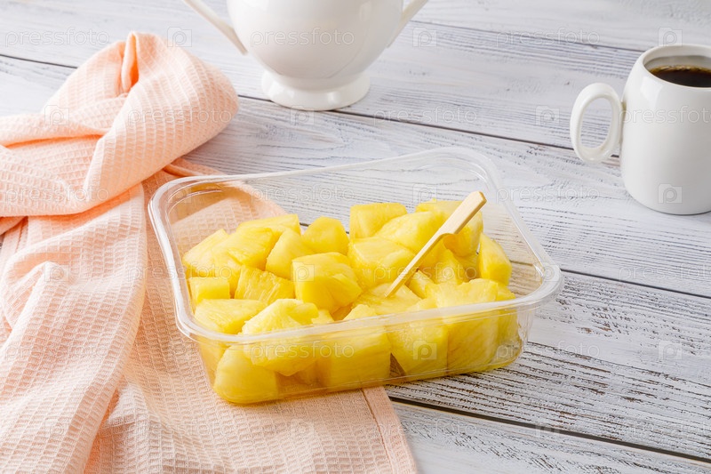 Фруктовый салат из ананаса в пластиковом контейнере на деревянном фоне