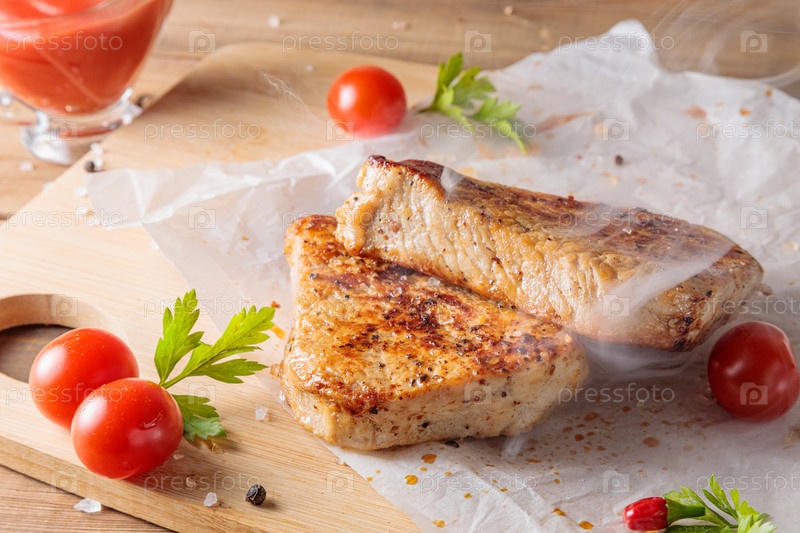 Кусочки жареной свинины с помидорами и кетчупом на деревянной доске