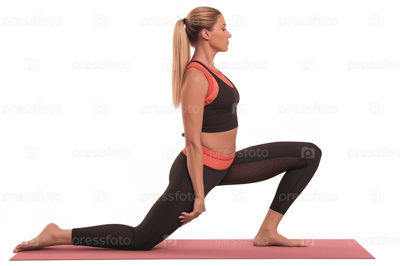 Женщина занимается йогой на коврике. Вид сбоку. Белый фон. Генеративный ИИ