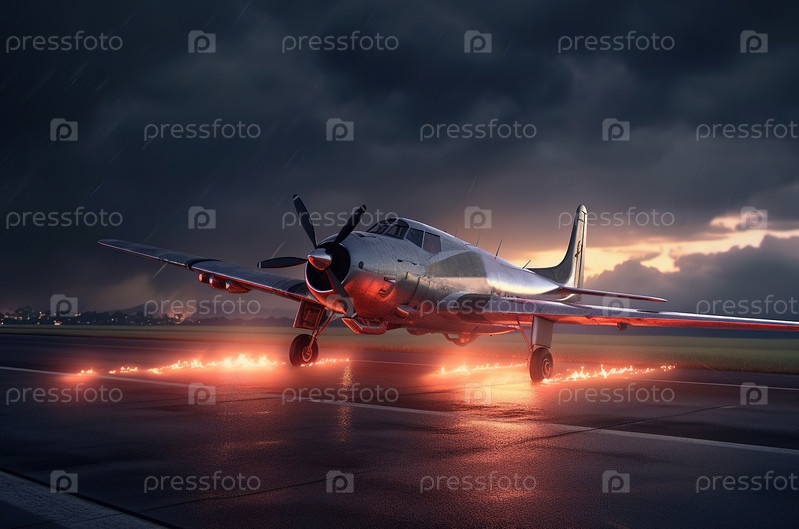 Огромный самолет на взлетно-посадочной полосе при аварийной посадке. Атмосферное настроение. Генеративный ИИ. Иллюстрация высокого качества