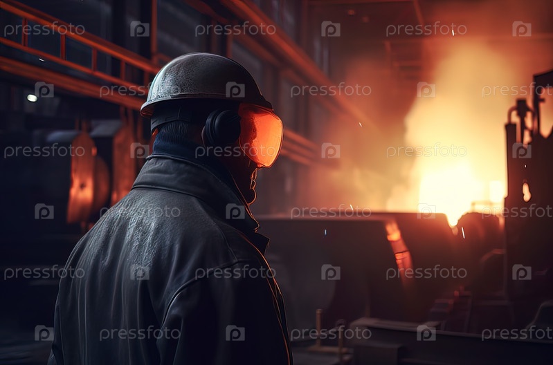Сталевар в каске у металлургической печи наблюдает, как из нее льется горячая сталь. Генеративный ИИ. Иллюстрация высокого качества