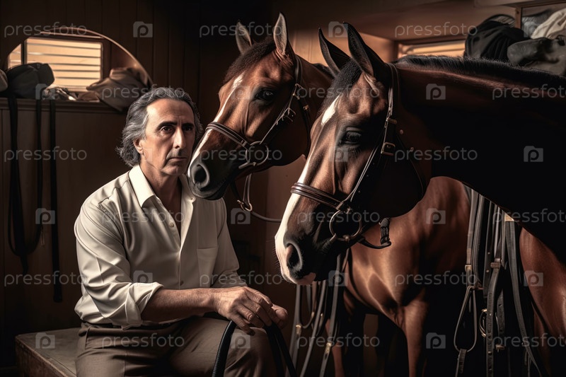 Человек, у которого есть лошади, сидит в конюшне со своими животными. Генеративный ИИ