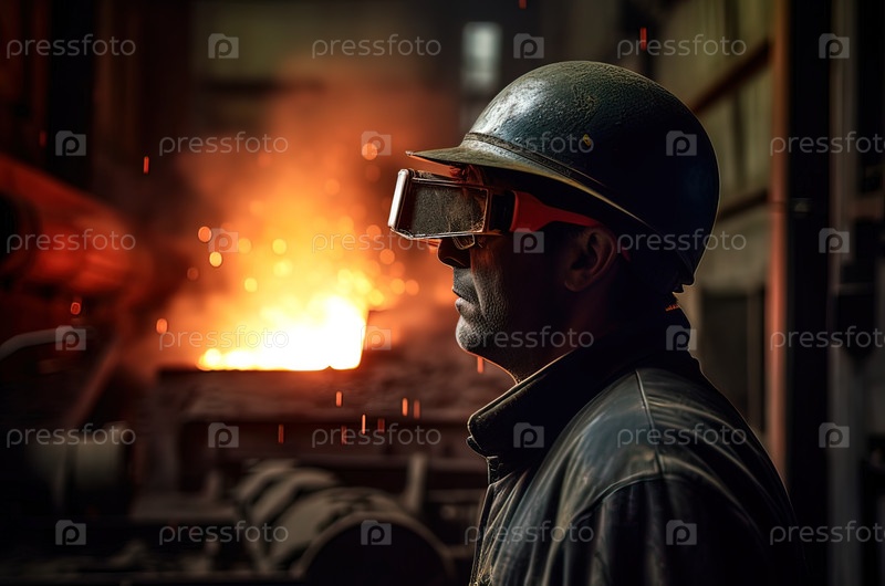 Сталевар в каске у металлургической печи наблюдает, как из нее льется горячая сталь. Генеративный ИИ. Иллюстрация высокого качества