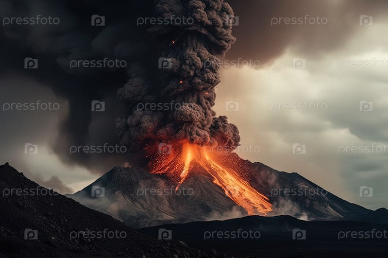 Извержение вулкана в горах с столбом лавы и дыма Генеративный ИИ Иллюстрация высокого качества