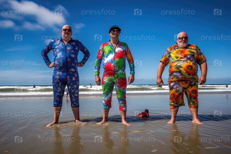 Толстяки в пляжных костюмах у моря. Генеративный ИИ. Иллюстрация высокого качества