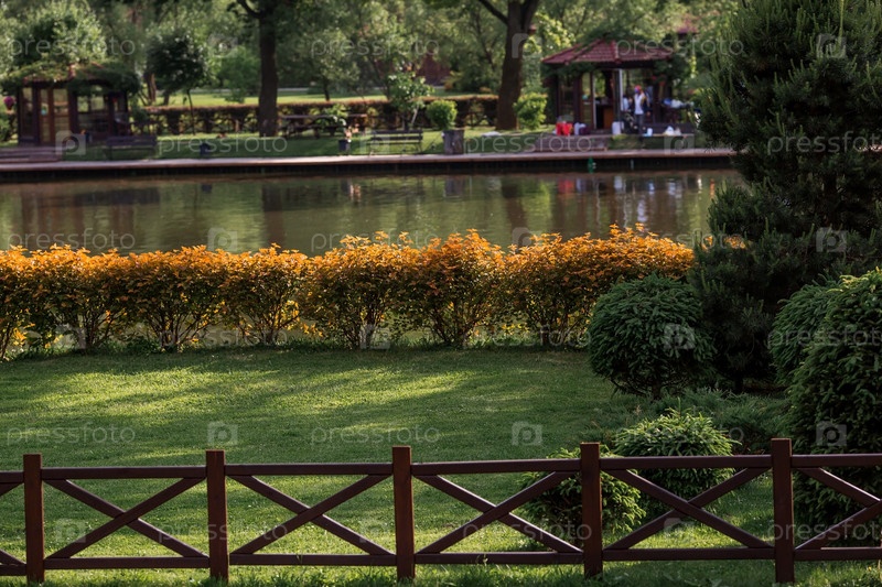 Красивый ландшафтный дизайн в парке. Подстриженные деревья, ровный газон. Сюжетный дизайн. Концепция отдыха на природе