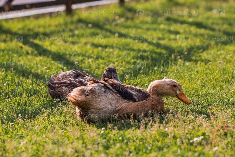 Утки на птицефабрике на зеленой траве и грызут траву на природе в жаркий солнечный день. Разведение птиц. Семья