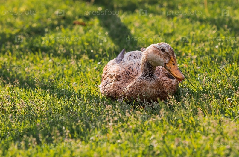 Утки на птицефабрике на зеленой траве и грызут траву на природе в жаркий солнечный день. Разведение птиц. Семья