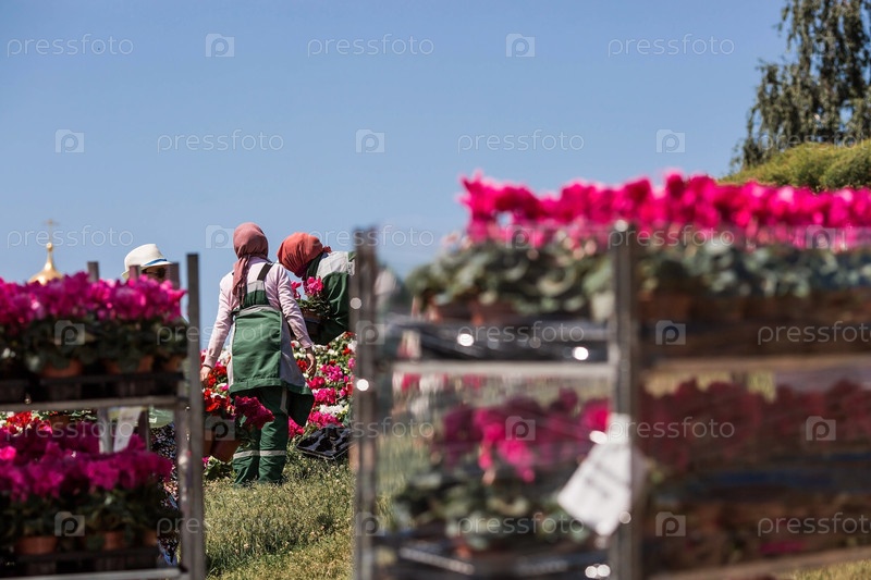 Благоустройство парка «Зарядье» в центре столицы. Россия. Москва. Люди в комбинезонах сажают цветы к летнему сезону
