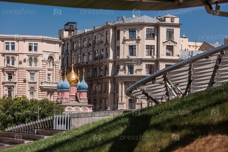 Москва, Россия, 2023: Церковь Святого Георгия Победоносца на Псковской горе. Вид на храм из парка «Зарядье»