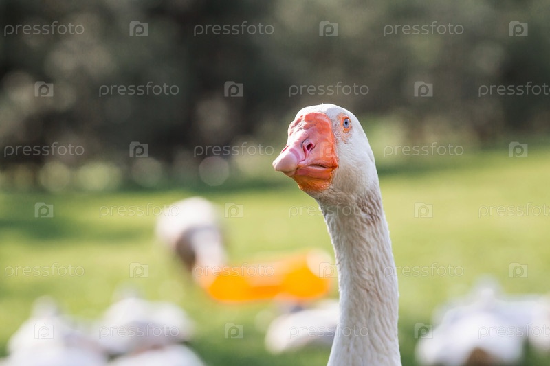 Белые домашние гуси на птицефабрике стоят на зеленой траве и щиплют траву на природе в жаркий солнечный день. Разведение птиц. Семья
