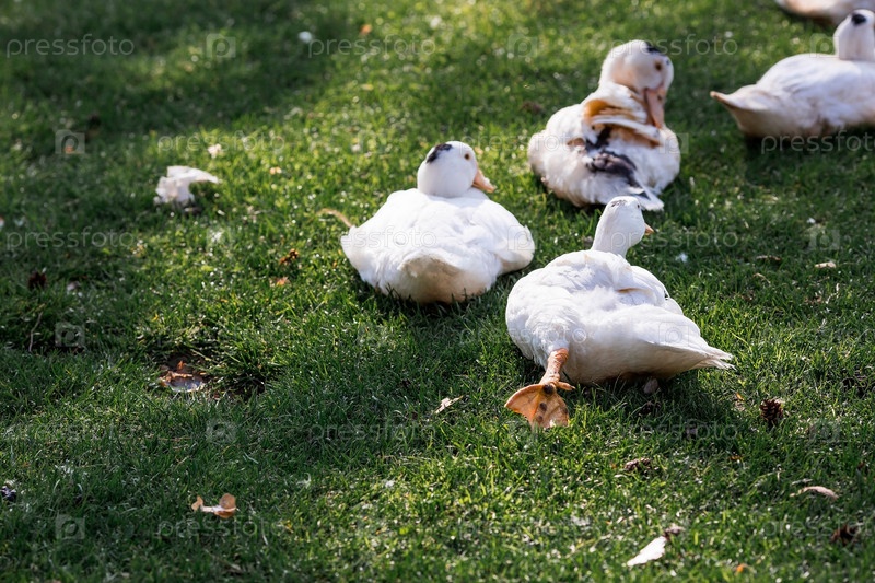 Белые домашние гуси на птицефабрике стоят на зеленой траве и щиплют траву на природе в жаркий солнечный день. Разведение птиц. Семья