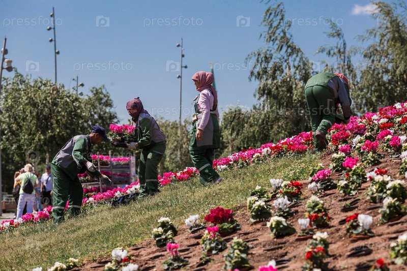 Благоустройство парка «Зарядье» в центре столицы. Россия. Москва. Люди в комбинезонах сажают цветы к летнему сезону