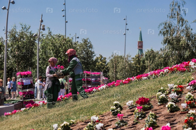 Благоустройство парка «Зарядье» в центре столицы. Россия. Москва. Люди в комбинезонах сажают цветы к летнему сезону