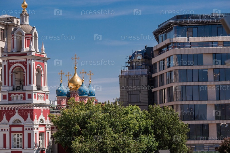Москва, Россия, 2023: Церковь Святого Георгия Победоносца на Псковской горе. Вид на храм из парка «Зарядье»