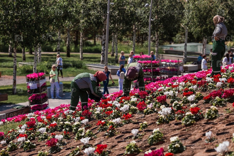 Благоустройство парка «Зарядье» в центре столицы. Россия. Москва. Люди в комбинезонах сажают цветы к летнему сезону