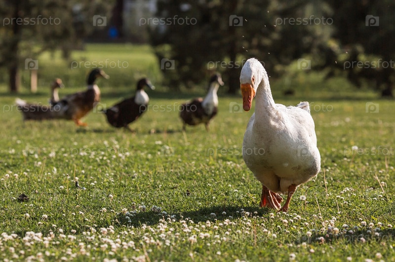 Белые домашние гуси на птицефабрике стоят на зеленой траве и щиплют траву на природе в жаркий солнечный день. Разведение птиц. Семья