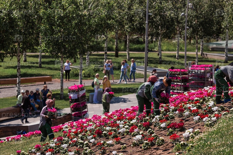 Благоустройство парка «Зарядье» в центре столицы. Россия. Москва. Люди в комбинезонах сажают цветы к летнему сезону