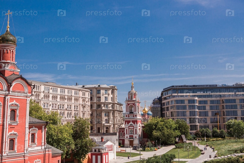 Москва, Россия, 2023: Церковь Святого Георгия Победоносца на Псковской горе. Вид на храм из парка «Зарядье»