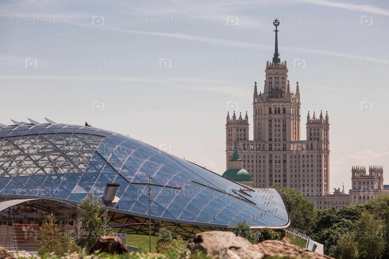 МОСКВА, РОССИЯ - 9 июня 2023 г.: Купол амфитеатра в парке "Зарядье" в Москве. Самая большая в мире полупрозрачная конструкция, которая согреет вас зимой
