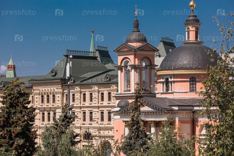 Москва, Россия: Храм великомученицы Варвары на улице Варварка возле Красной площади в солнечный летний день. Вид на храм со стороны парка «Зарядье»