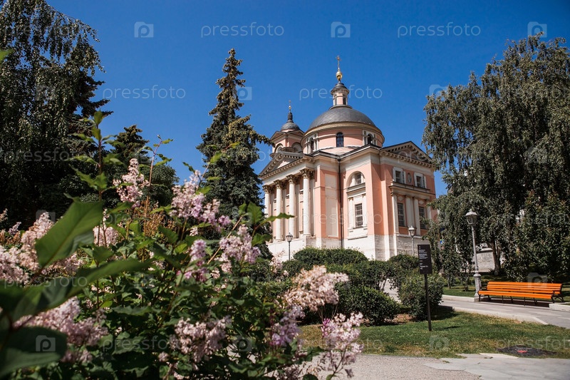 Москва, Россия: Храм великомученицы Варвары на улице Варварка возле Красной площади в солнечный летний день. Вид на храм со стороны парка «Зарядье»