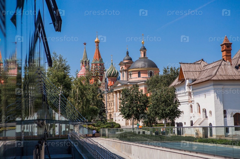 Москва, Россия: Церковь великомученицы Варвары и собор Василия Блаженного на улице Варварка возле Красной площади в солнечный летний день. Вид на храм из парка «Зарядье»