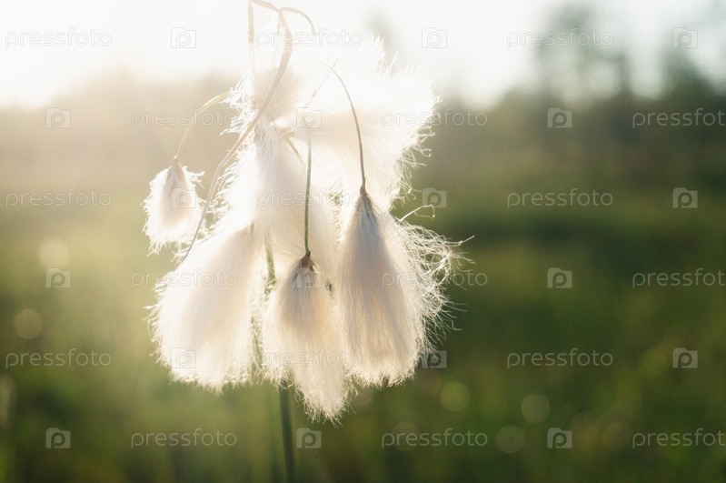 Пушистые цветы в лесу на болоте крупным планом. Пушица, северное растение, Мурманская область
