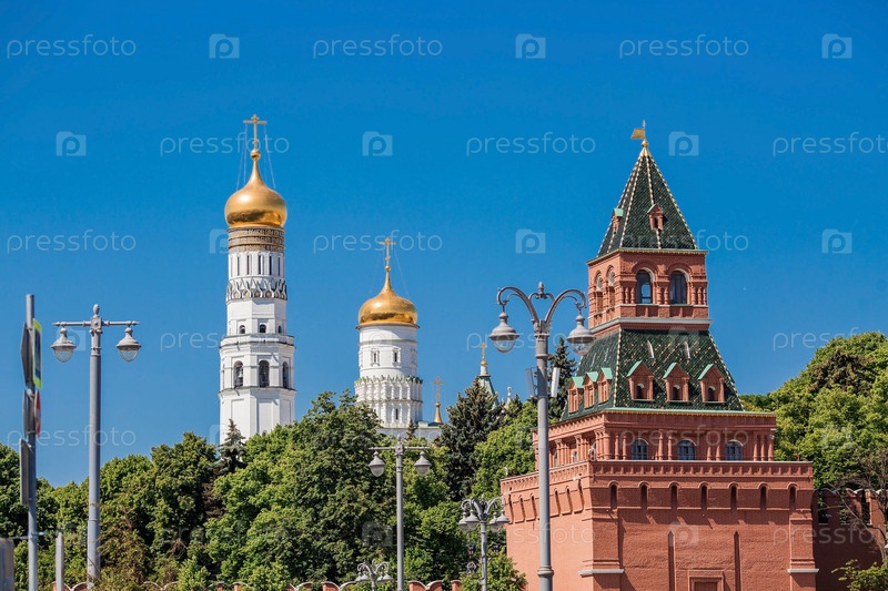 Москва, Россия, июнь 2023 г.: Вид на колокол Ивана Великого в Московском Кремле за Кремлевской стеной в солнечный летний день