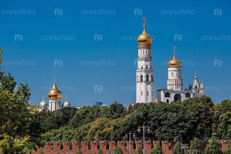 Москва, Россия, июнь 2023 г.: Вид на колокол Ивана Великого в Московском Кремле за Кремлевской стеной в солнечный летний день