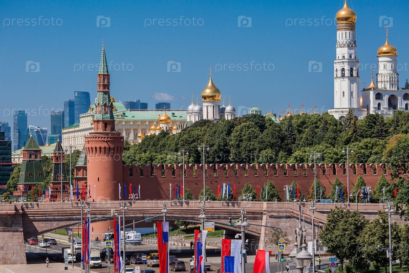 Москва, Россия, июнь 2023 г.: Вид на колокольню Ивана Великого, стены Кремля и Большой Москворецкий мост в солнечный летний день