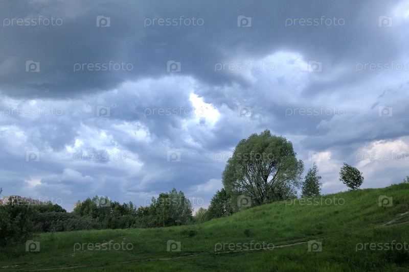 Грозовое небо затянуто деревьями в зеленом травяном поле летний природный пейзаж