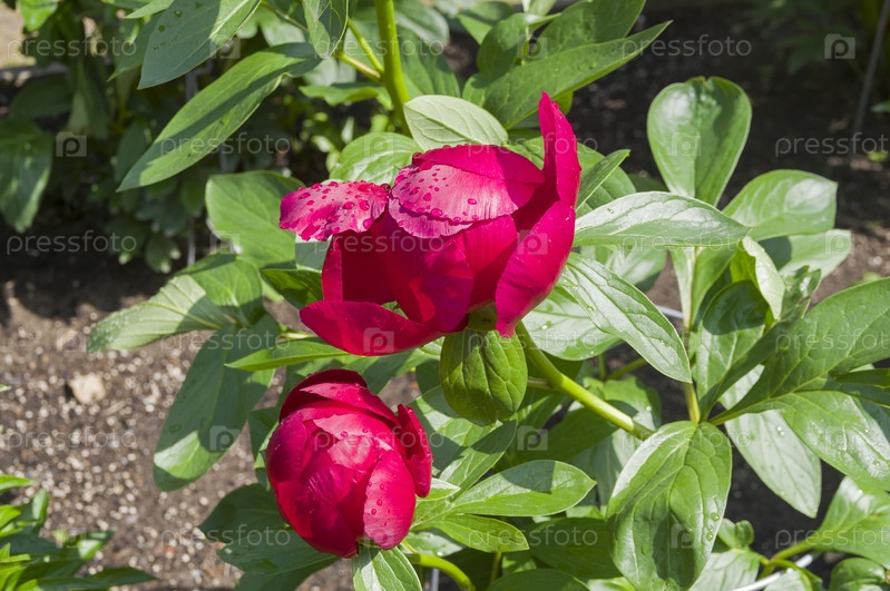 Цветение красно-марузового пиона сорта Постильон (Postillion) в Аптекарском саду (филиал ботанического сада МГУ).Москва