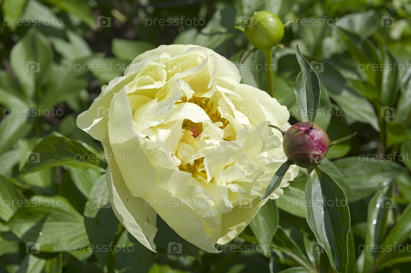 Цветение светло-желтого пиона сорта 'Солнечная девушка' (Sunny Girl) в Аптекарском саду (филиал ботанического сада МГУ).Москва