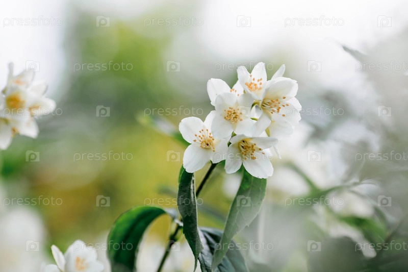 Крупный план цветущего белого жасмина. Цветы и бутоны на закате. Зеленый естественный фон. Красивое боке. Копия текстового пространства