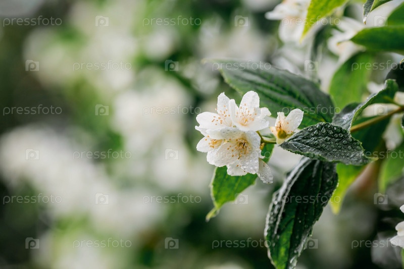 Крупный план цветущего белого жасмина. Цветы и бутоны на закате. Зеленый естественный фон. Красивое боке. Копия текстового пространства