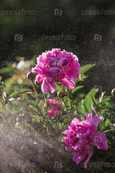 Крупный план цветущего розового пиона. Цветок и бутон в каплях дождя на закате. Зеленый естественный фон. Цветущий сад. Красивое боке
