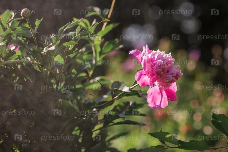 Крупный план цветущего розового пиона. Цветок и бутон в каплях дождя на закате. Зеленый естественный фон. Цветущий сад. Красивое боке