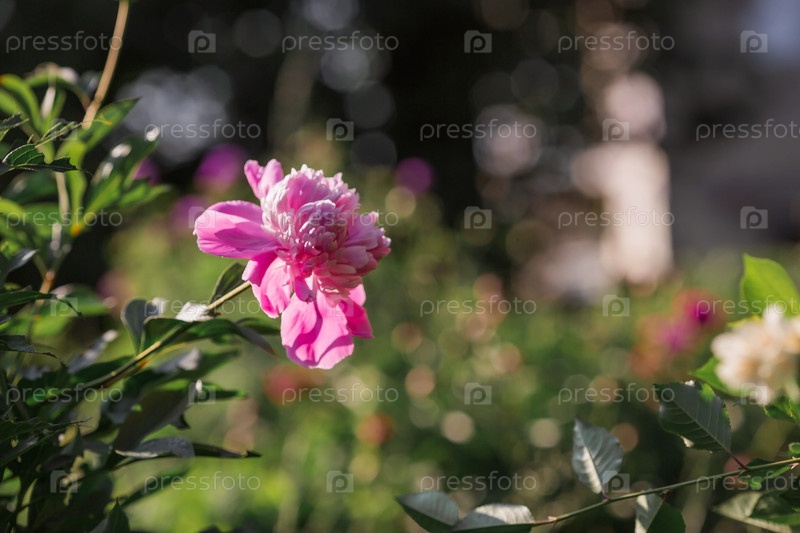 Крупный план цветущего розового пиона. Цветок и бутон в каплях дождя на закате. Зеленый естественный фон. Цветущий сад. Красивое боке