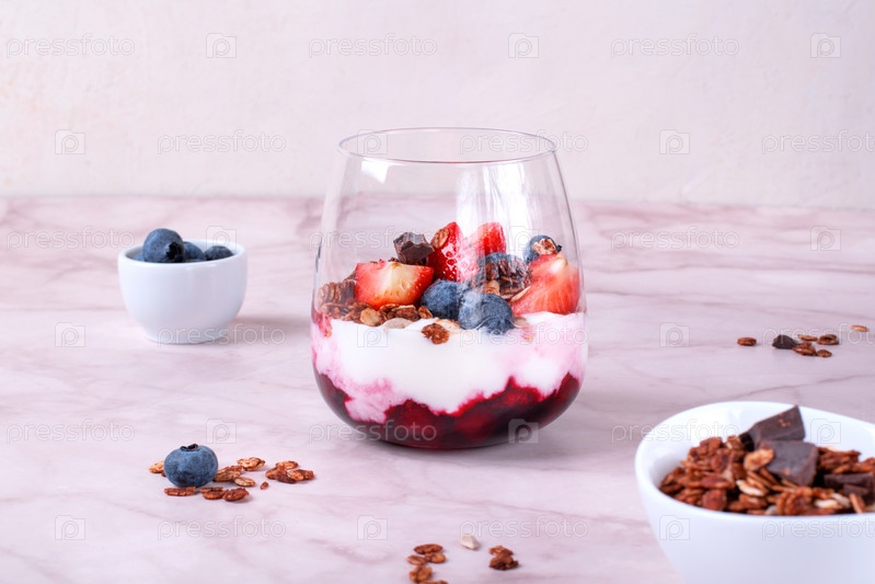 Йогурт с шоколадной гранолой и вишневым соусом, увенчанный клубникой и черникой, подается в стакане. Здоровый завтрак