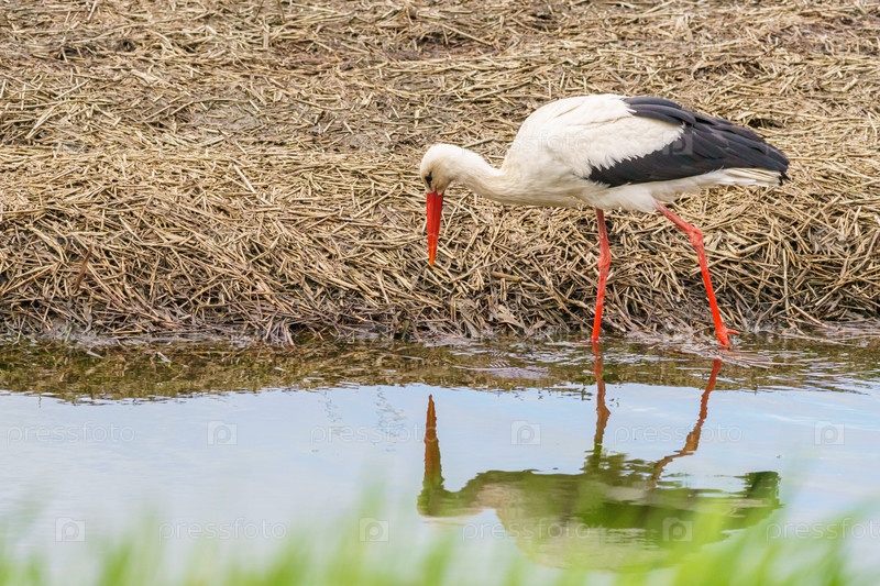 Крупный план белой осины (Ciconia ciconia), которая ищет пищу в траве