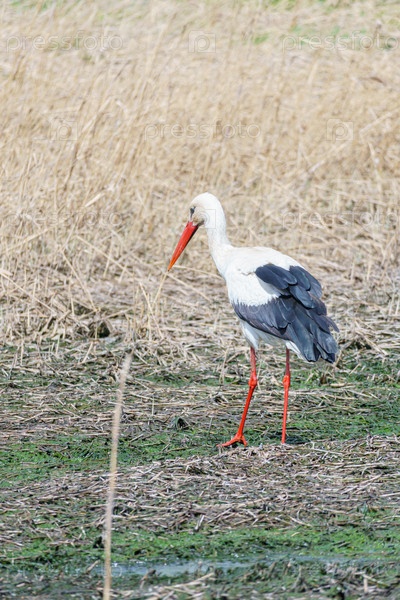 Крупный план белой осины (Ciconia ciconia), которая ищет пищу в траве