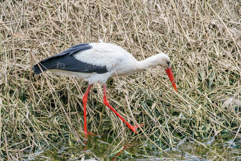 Крупный план белой осины (Ciconia ciconia), которая ищет пищу в траве