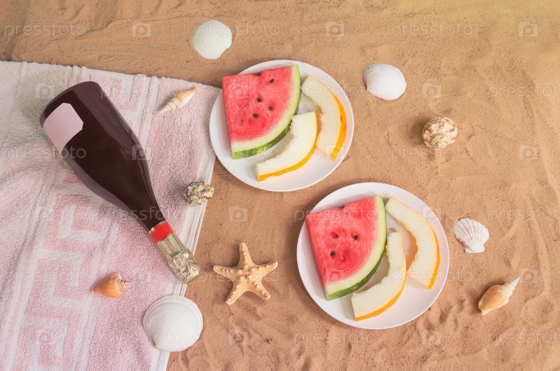 Арбуз, дыня, бутылка шампанского, морские звезды и ракушки на песчаном пляже. Вид сверху