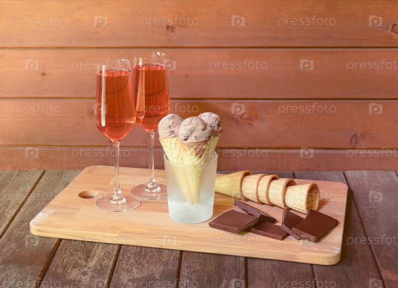 Розовое шампанское, шоколадное мороженое, темный шоколад и пустые вафельные рожки. Выборочный фокус