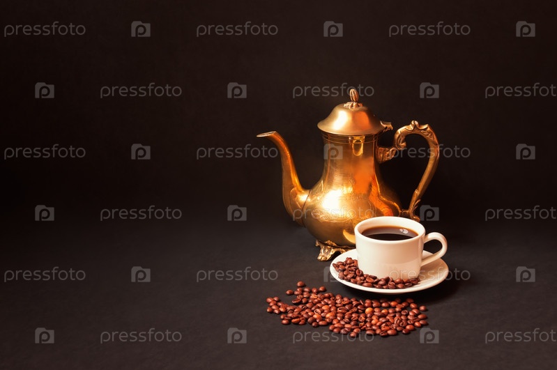 Кофейник, кофейная чашка и кофейные зерна на темном фоне