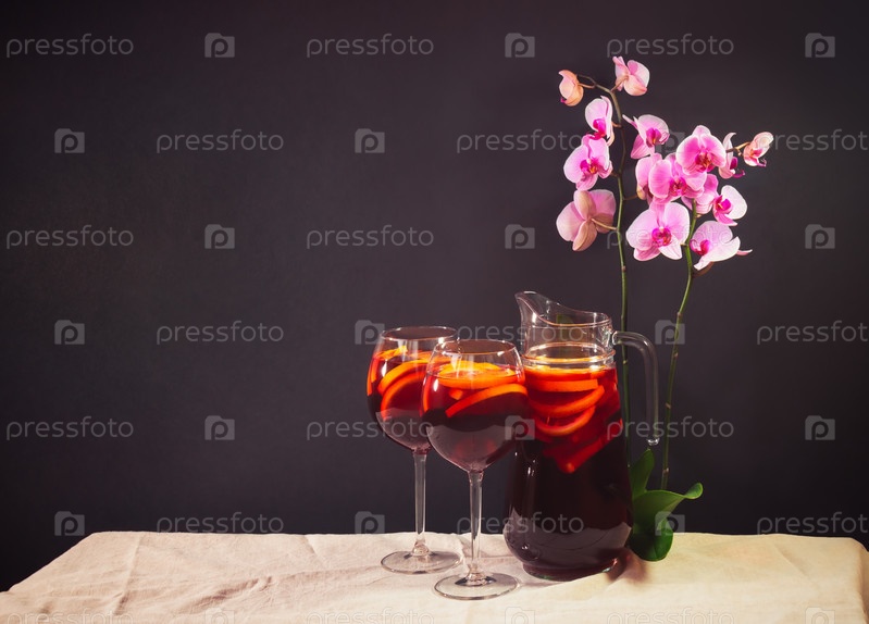 Сангрия из красного вина с фруктами в стаканах и кувшином на столе. Фиолетовая орхидея рядом. Темный фон
