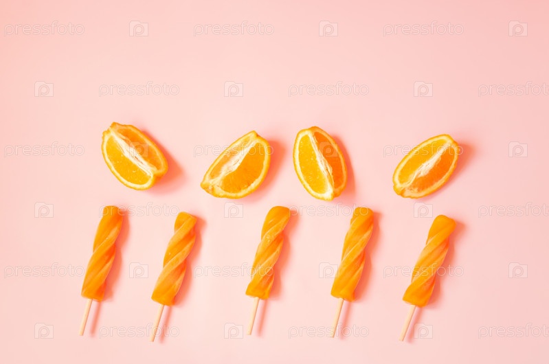 Спиральное апельсиновое мороженое и свежие апельсины в качестве границы на розовом фоне